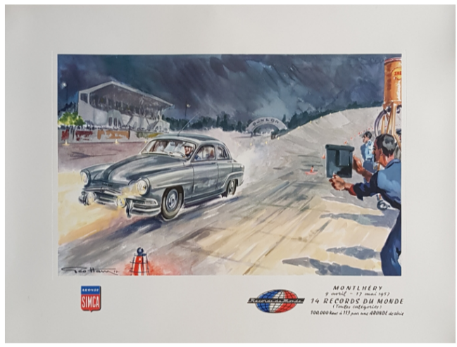 Lithographie de GEO HAM - Simca Aronde à Montlhery 1957